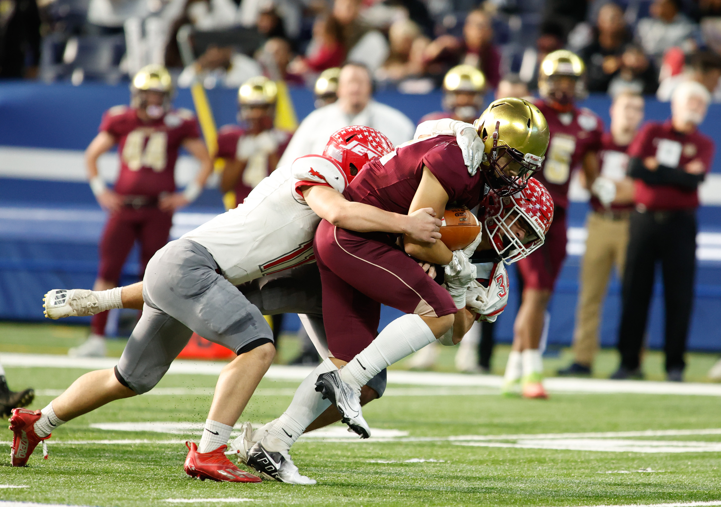 Indianapolis, Ind. – Adams Central’s Ryan Black (11), left and Blake Heyerly, right, combine to tackle Indianapolis Lutheran running back Joe Davis (22) after Davis picked up a first down in the second half of the Class A state championship game on Friday, Nov. 26, at Lucas Oil Stadium. Photo by Chad Ryan