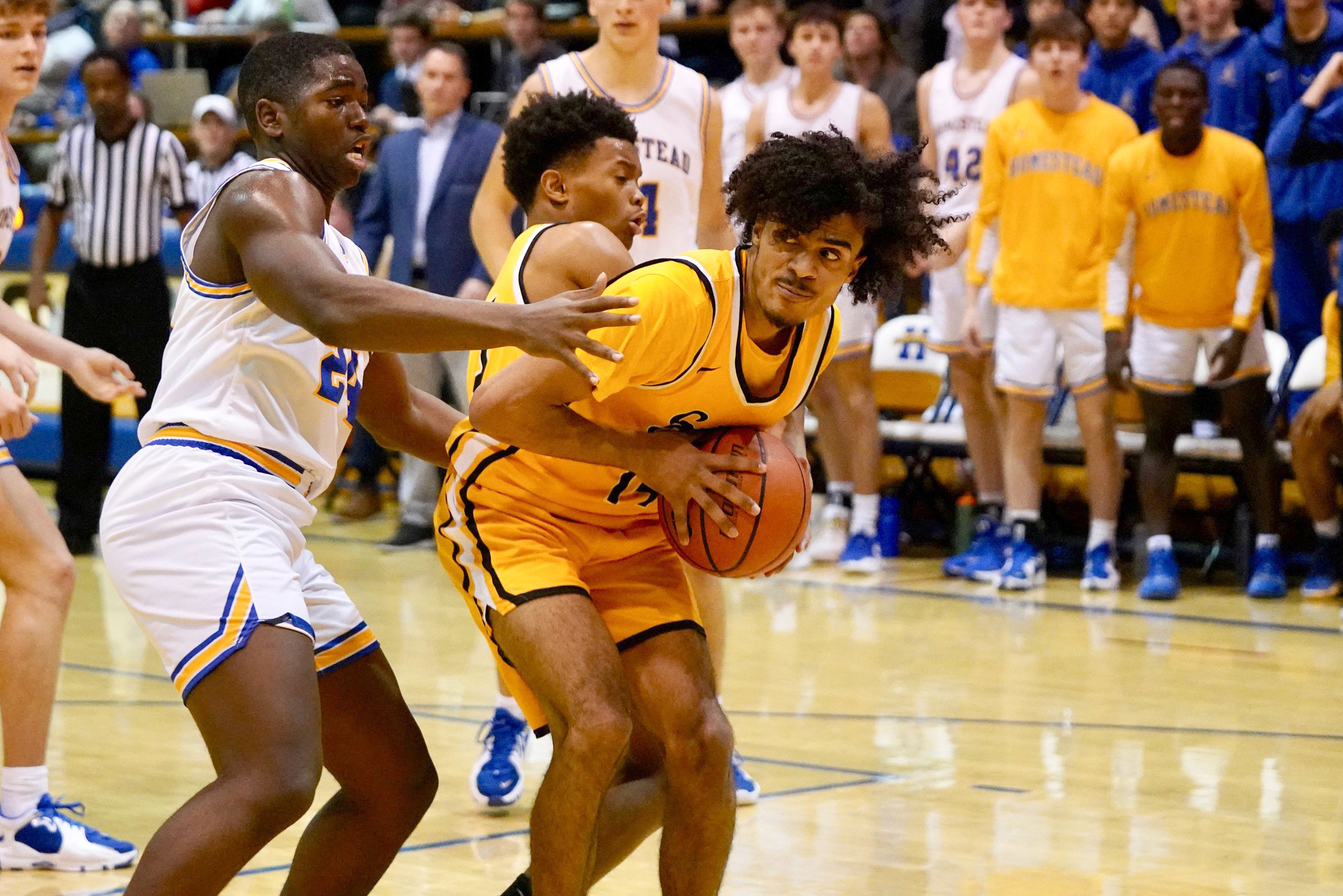 Snider’s Aidan Lambert works to clear the ball during January 14’s game at Homestead. (Photo by Leslie Palmer)