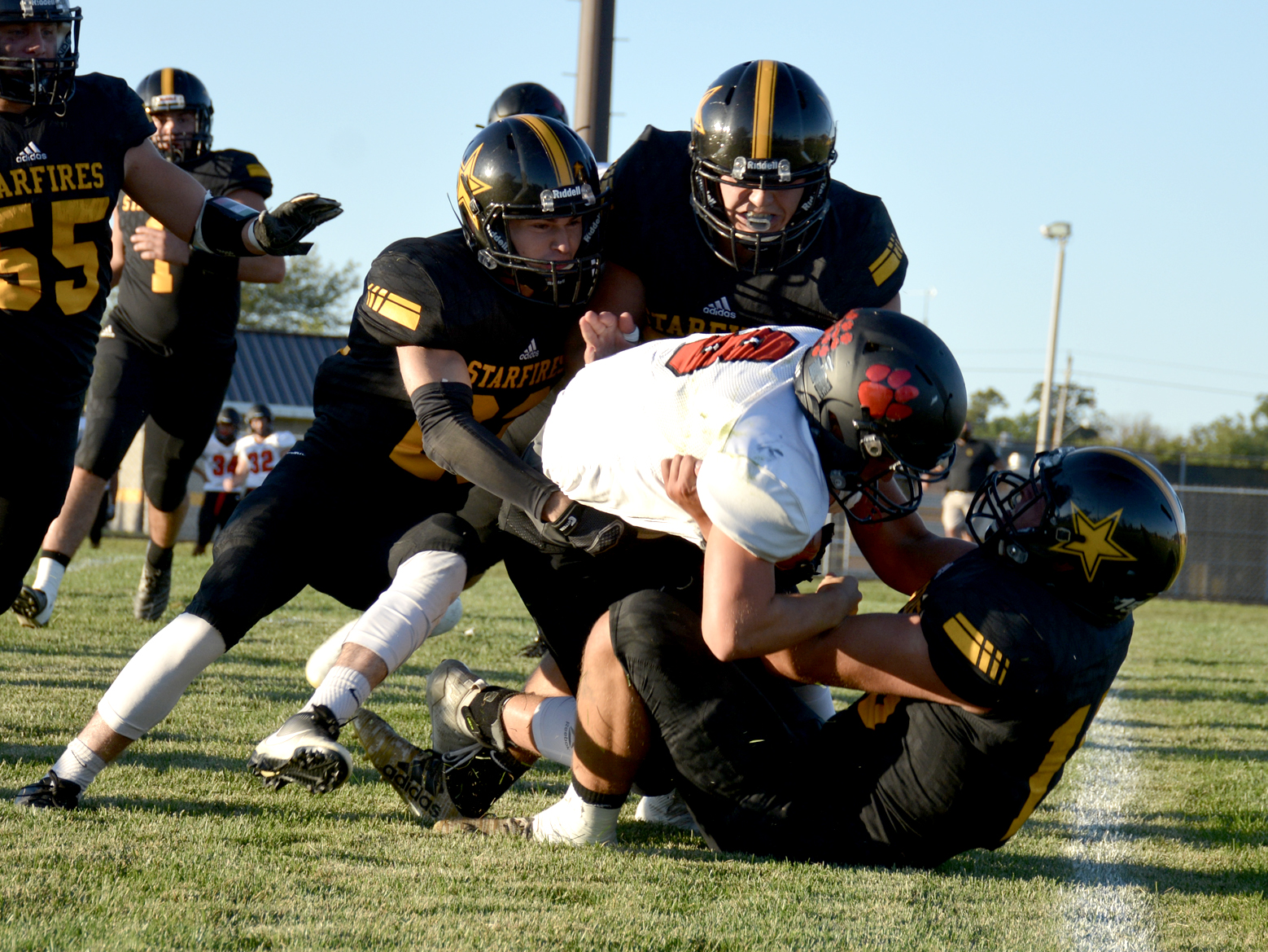 Alex Gorney, Austin Gorney and Nick Miller of South Adams team up to take down Bluffton quarterback Lukas Hunt during a September 4 game.