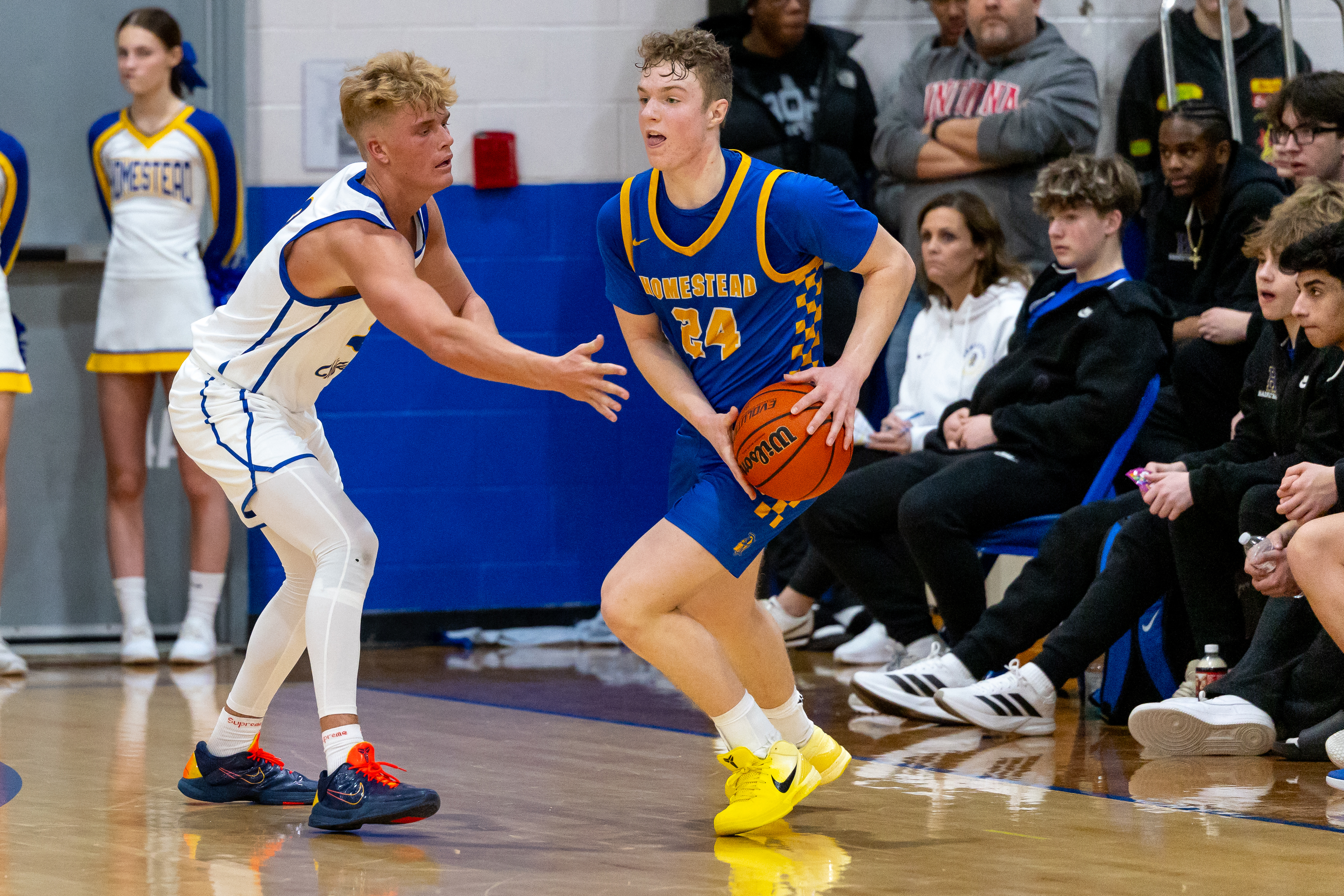 Homestead’s Jake Coolman handles the ball during a January 13 game at Blackhawk Christian. (Photo by Leverage Photography)