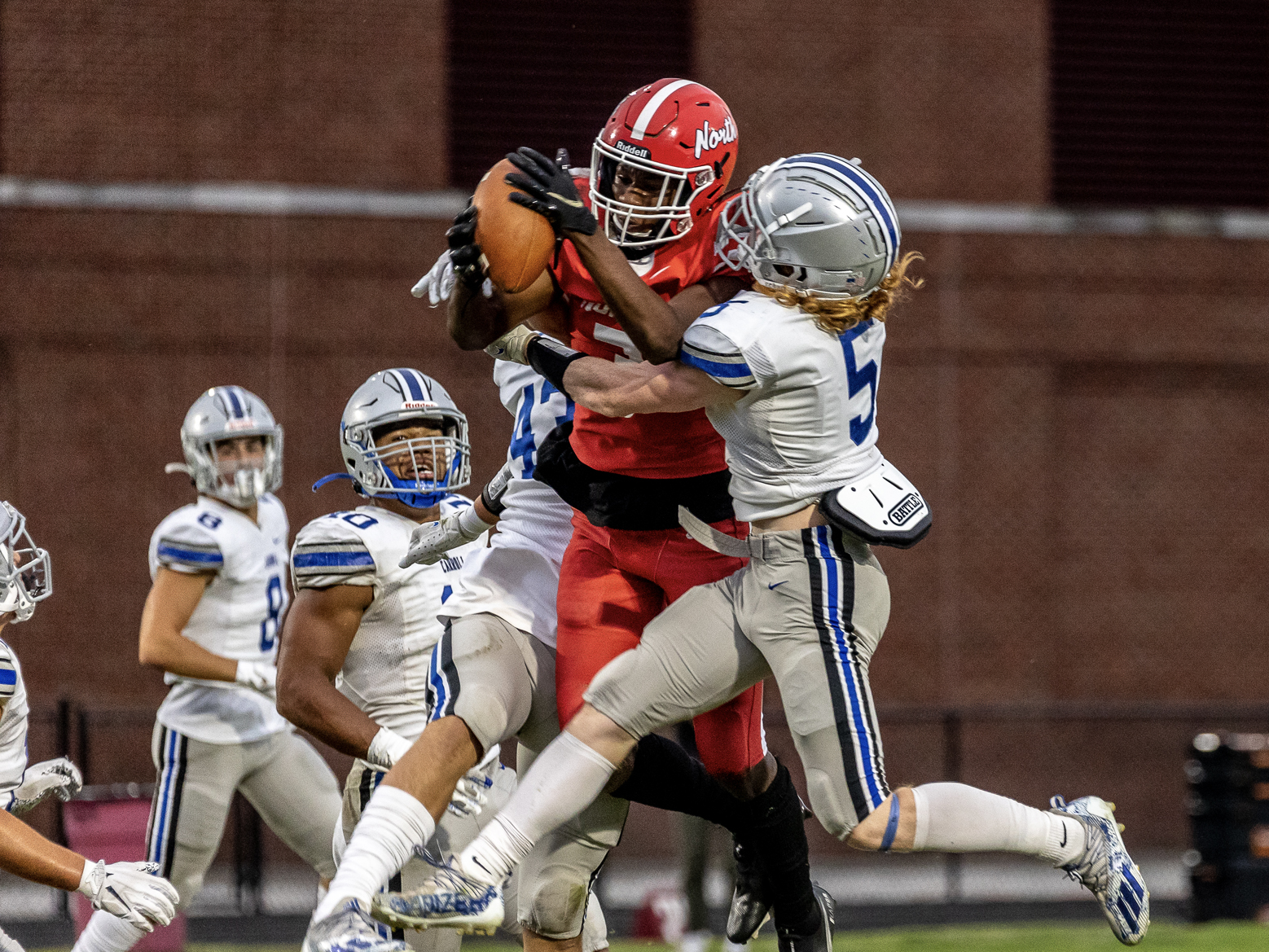 North Side’s Brauntae Johnson catches a pass against the Carroll defense during a September 3, 2021 game. (Photo by Leverage Photography)