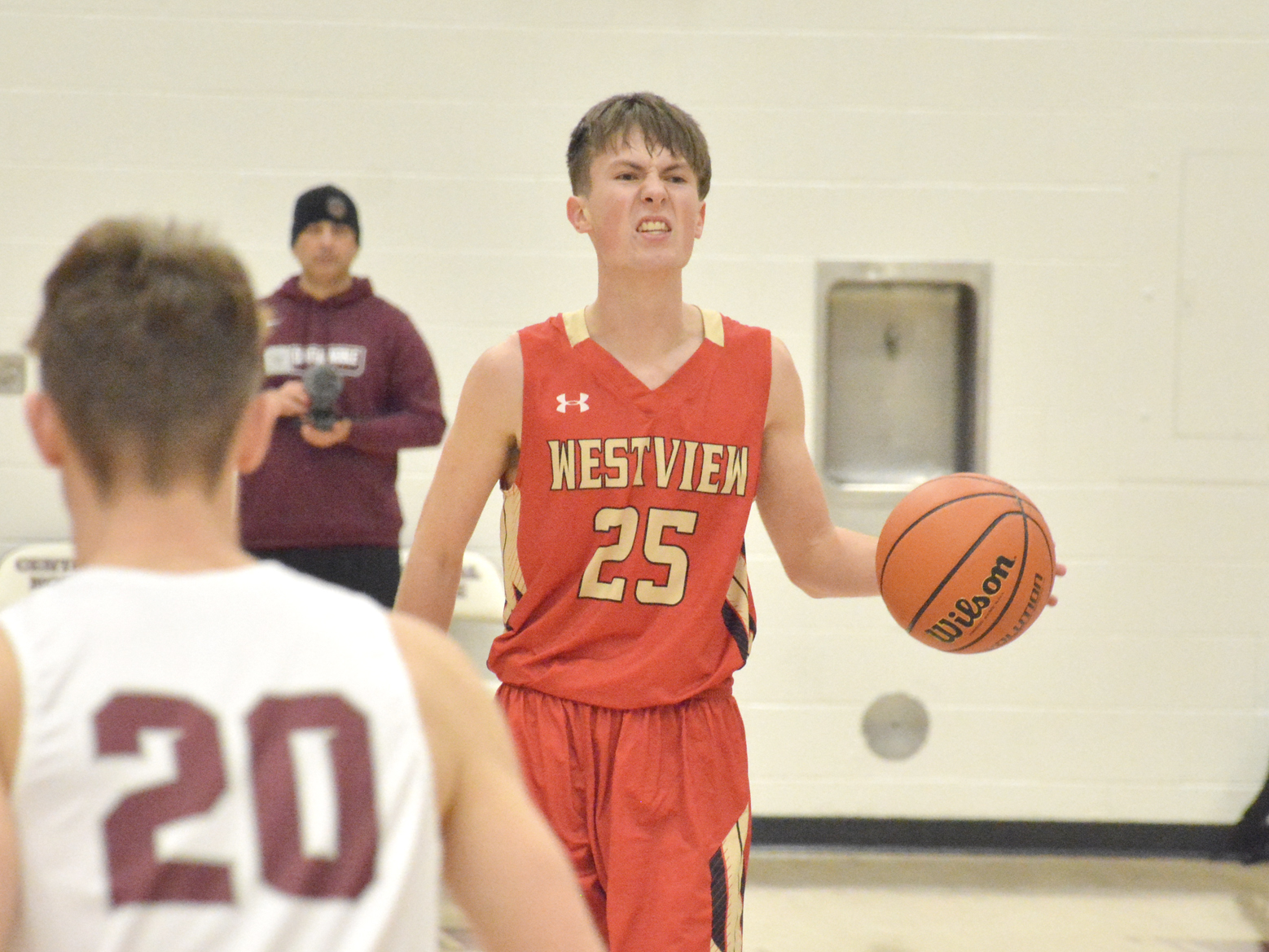 Westview’s Drew Litwiller brings the ball up the court during a December 14, 2019 game at Central Noble.