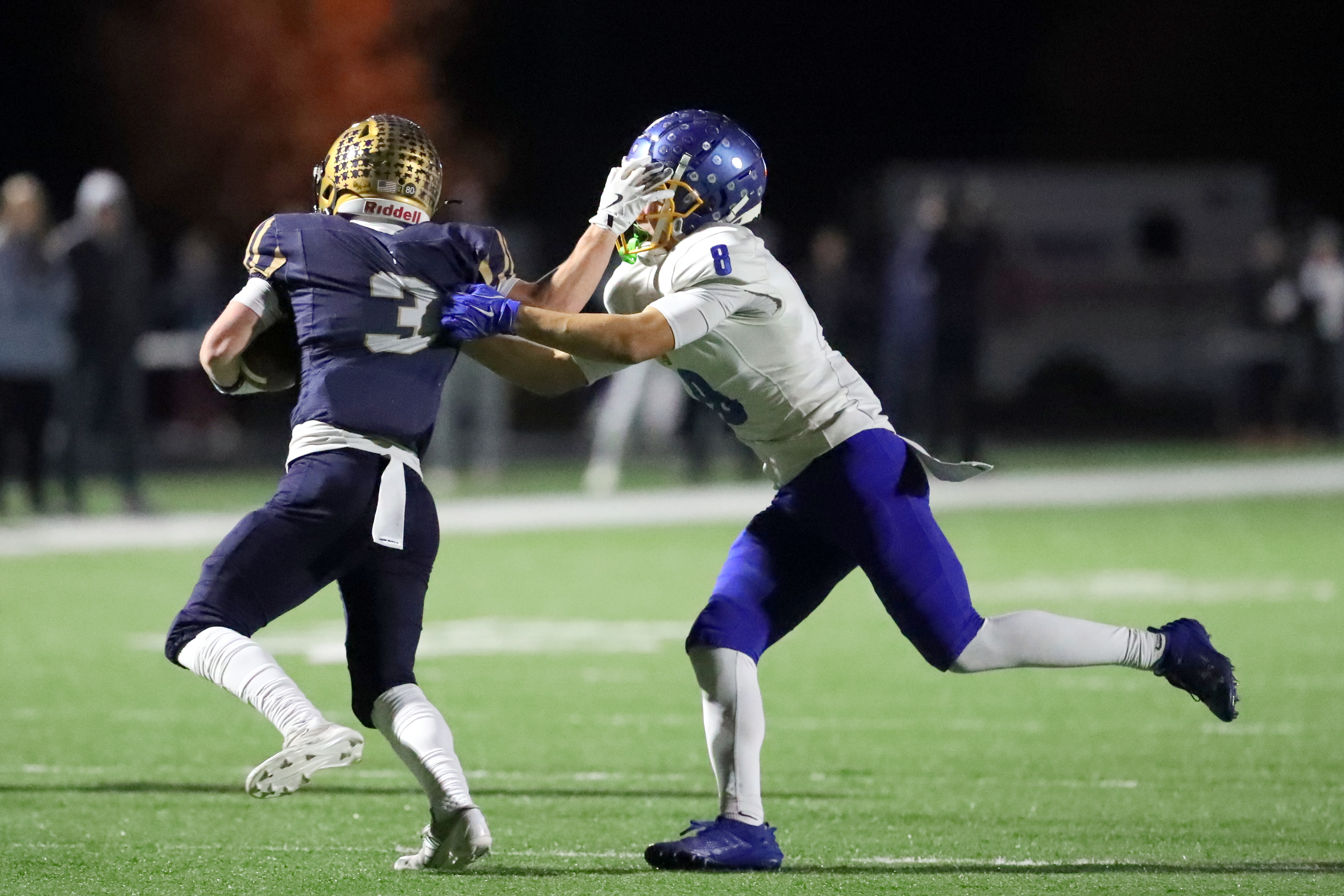 Bishop Dwenger senior Brady O’Keefe looks to shake off the tackle attempt by East Noble senior Logan Hatton during Friday’s sectional title championship game at Shields Field. (Photo by Terry Lewis)
