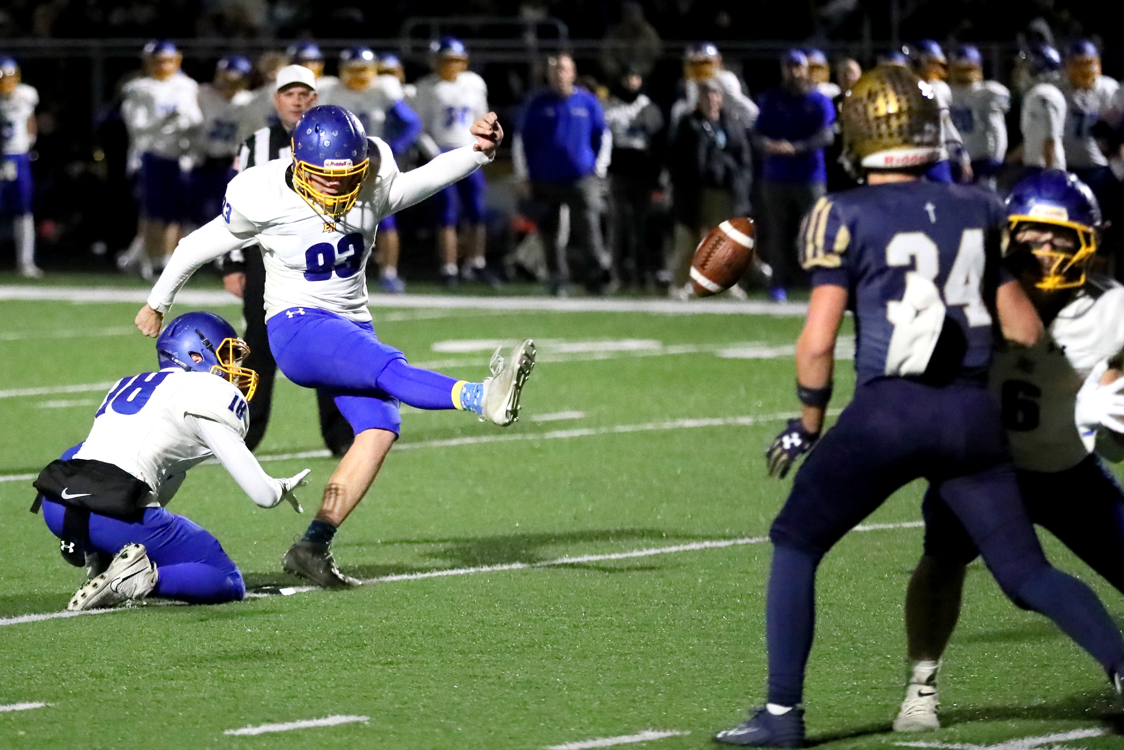 East Noble kicker Alex Sprague launches a kick during Friday’s sectional championship game against Bishop Dwenger at Shields Field. (Photo by Terry Lewis)