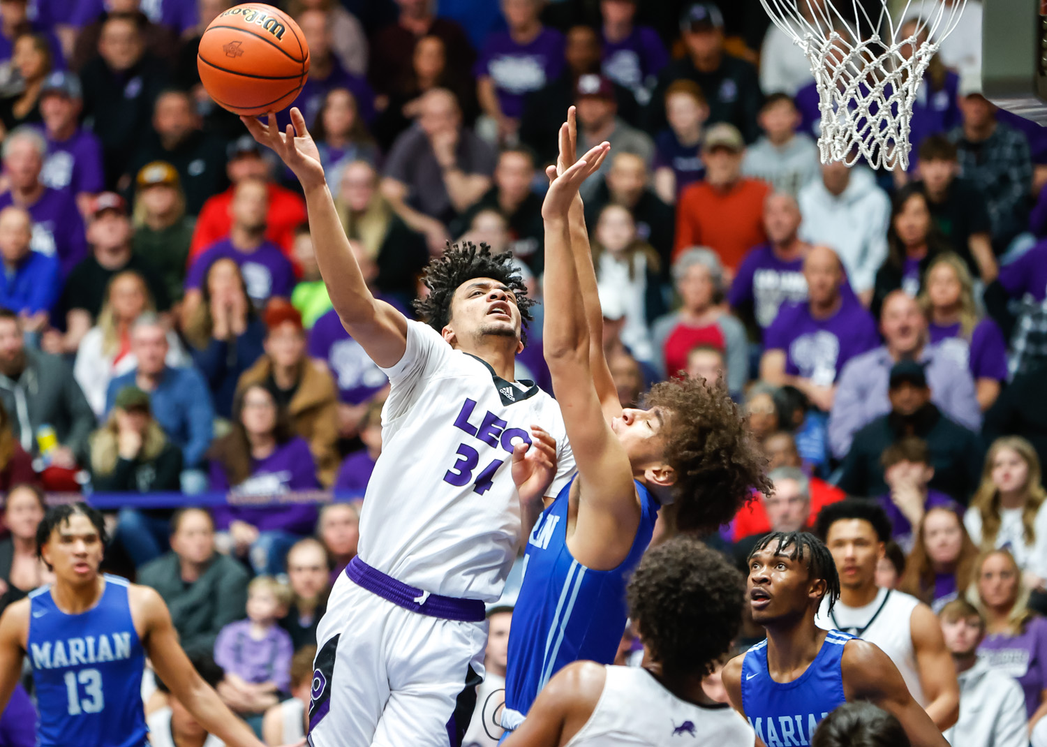 Leo’s Caedmon Bontrager (34), left, flips the basketball toward the basket after drawing a foul from Mishawaka Marian’s Ky’rell Franklin (4) in the third quarter of the Class 3A semistate championship on Saturday at Elkhart North Side Gymnasium.