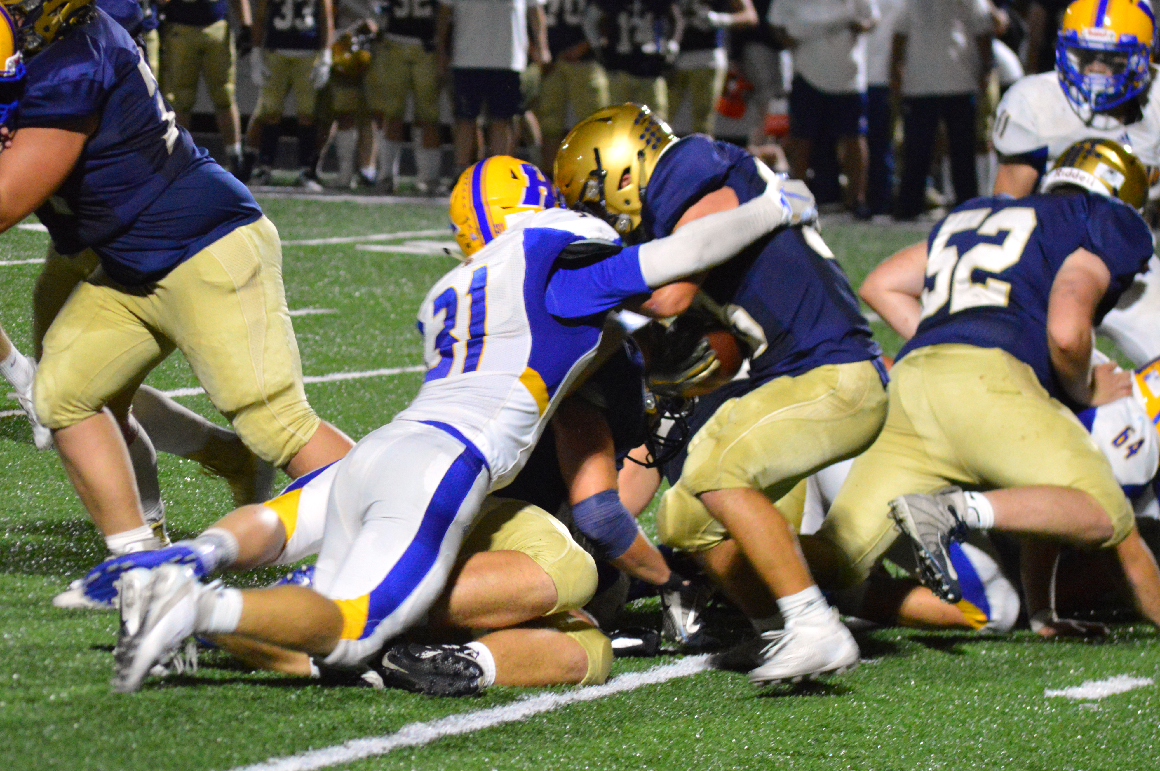 Homestead’s Luke Palmer hits a Bishop Dwenger’s Lucas Krohn during September 13’s game at Shields Field. (Photo by Homestead High School Media Department)
