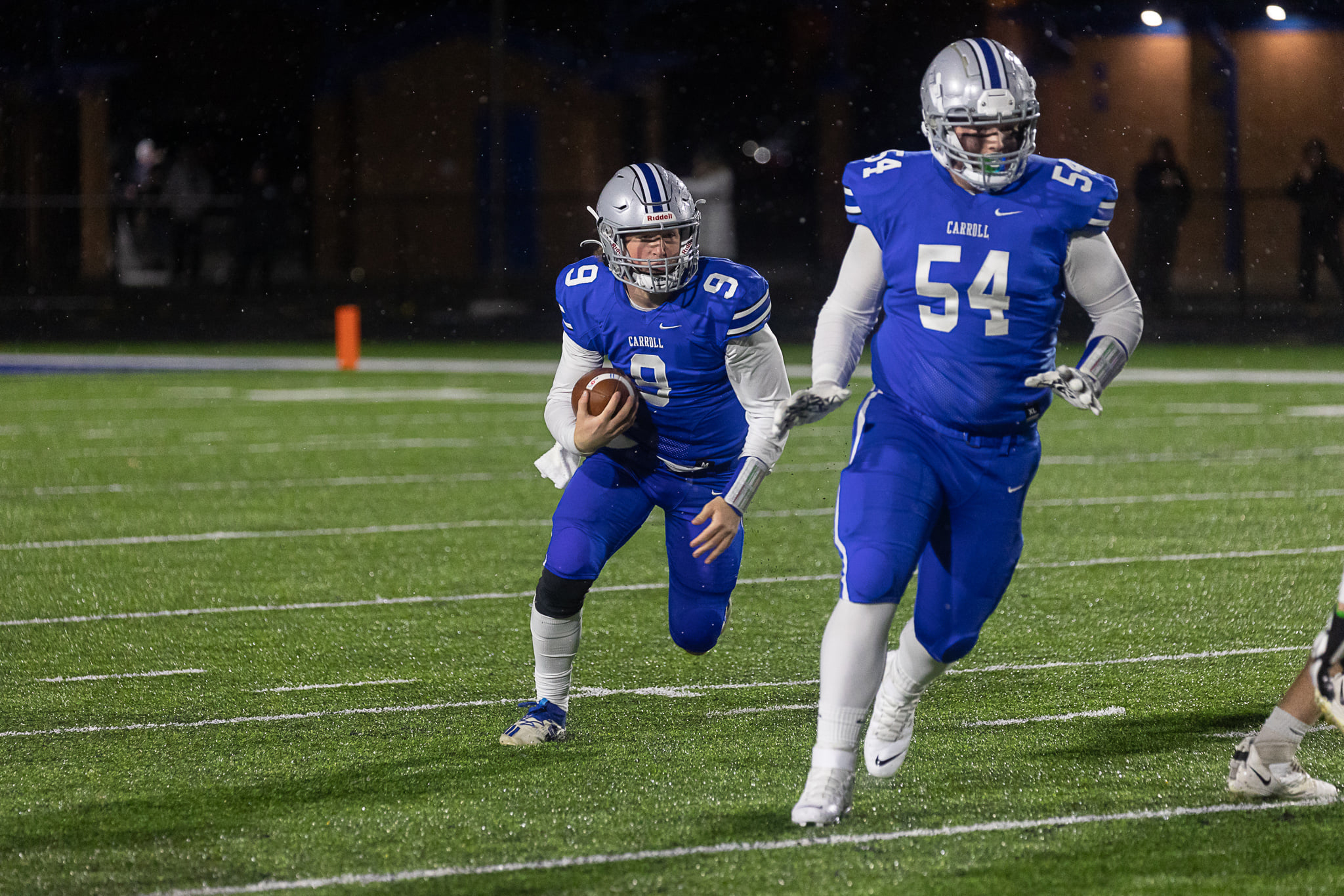 Carroll’s Jeff Becker races behind the block of Jamie Molargik during November 12’s Class 6A Regional game against Westfield. (Photo by. Leverage Photography)