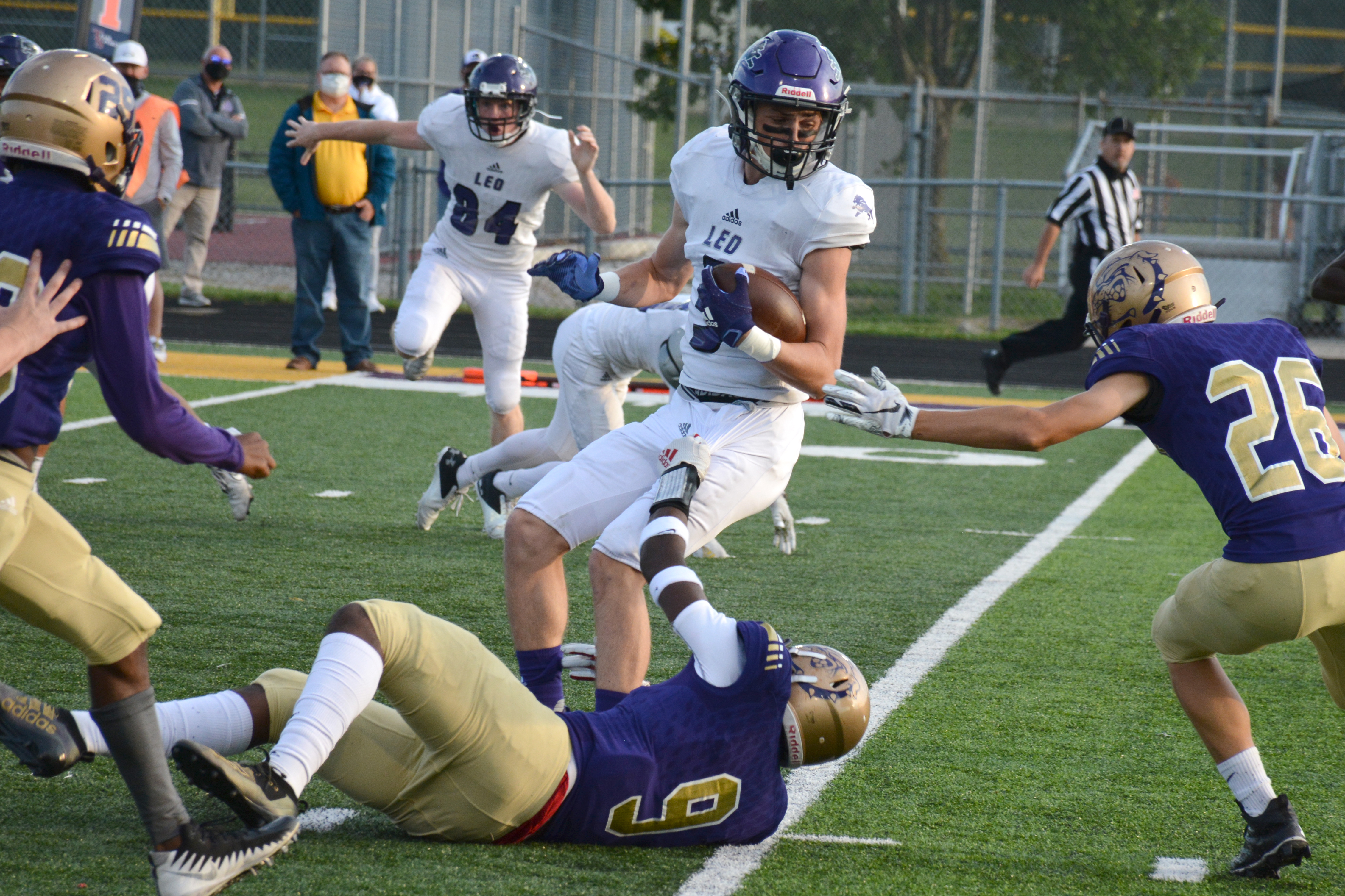 Leo’s Rylan Crawford fights through the New Haven defense during a September 11 game.