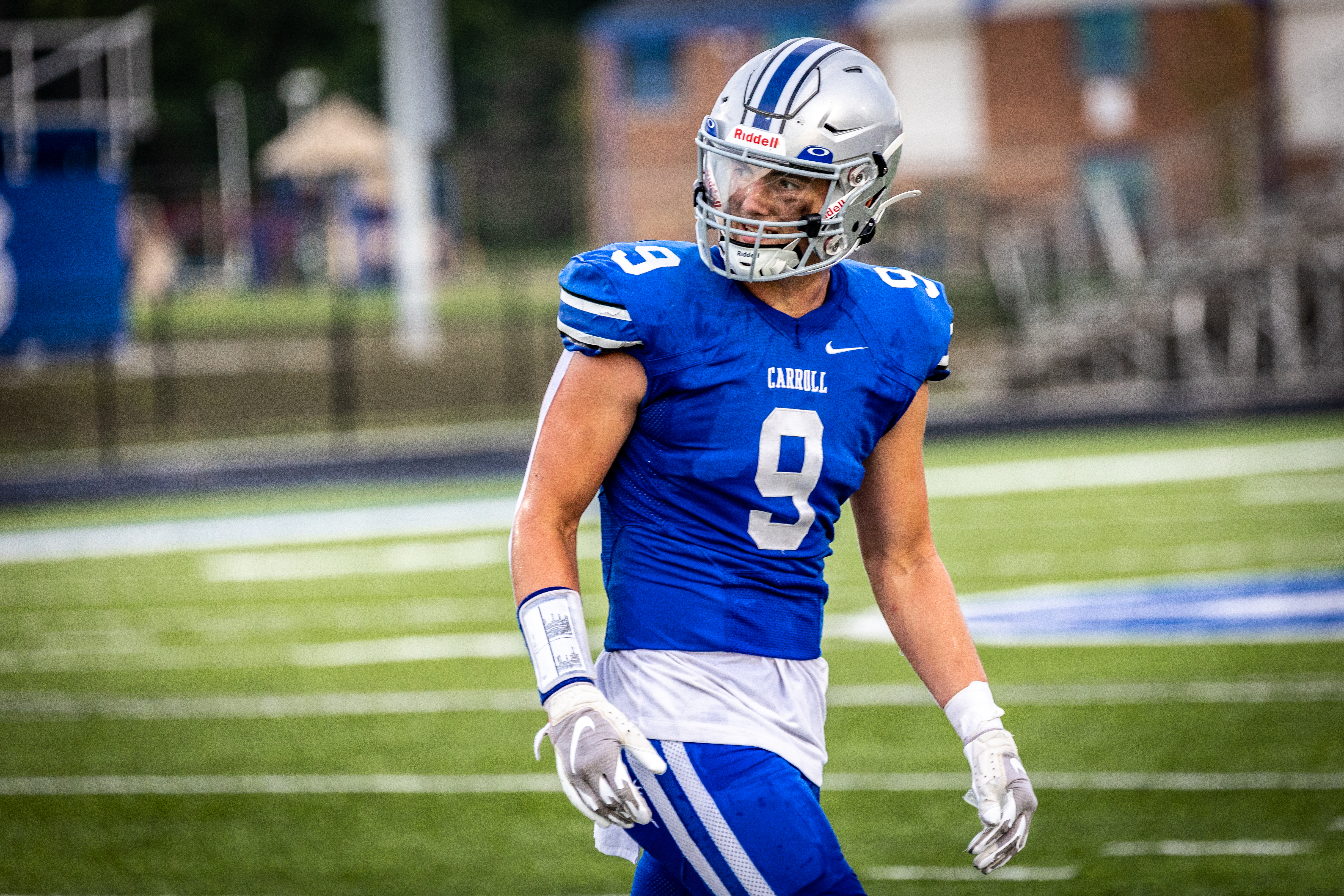 Carroll’s Maxton Wiard looks on before the ball is snapped during a September 2 game against North Side. (Photo by Leverage Photography)